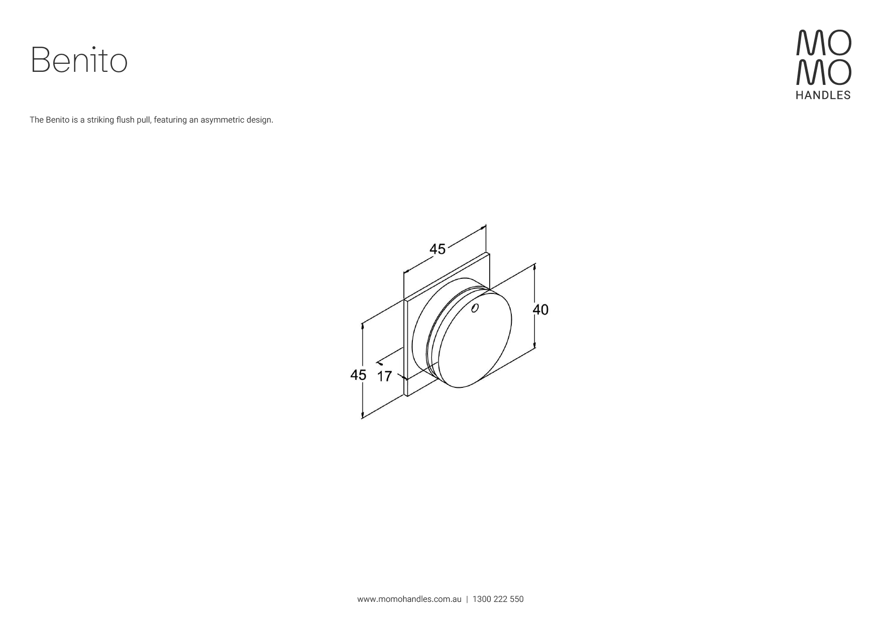 The Benito is a striking flush pull, featuring an asymmetric design.