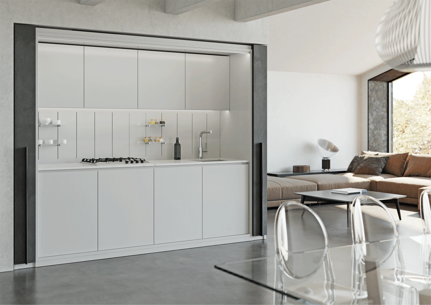 Exedra2 Star completely conceals the door panels behind the cover panel whether the doors are open or closed. With completely free unobstructed access available for widths up to 2985mm, the Exedra2 Star is the perfect choice for elegant concealment of wardrobes, kitchens, pantries, office areas, butlers’ pantries and a host of other applications.